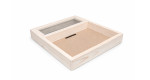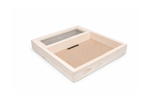 Drevený rám, v ktorom je osadená vetracia mriežka a do ktorého sa vkladajú plastové kŕmidlá rôznych objemov.